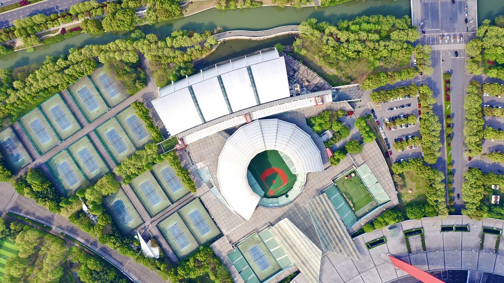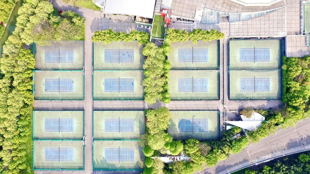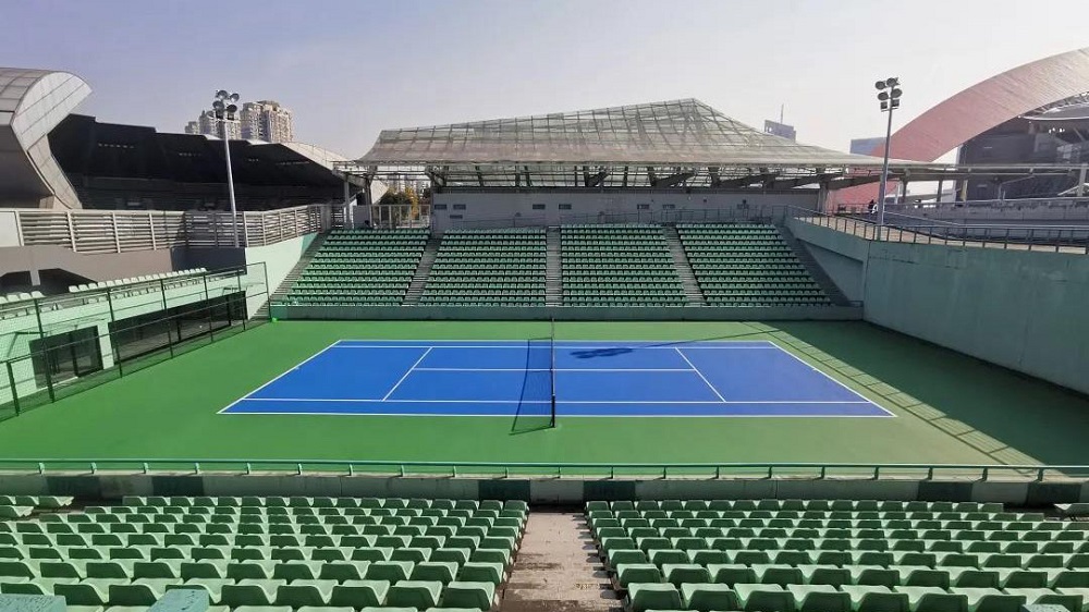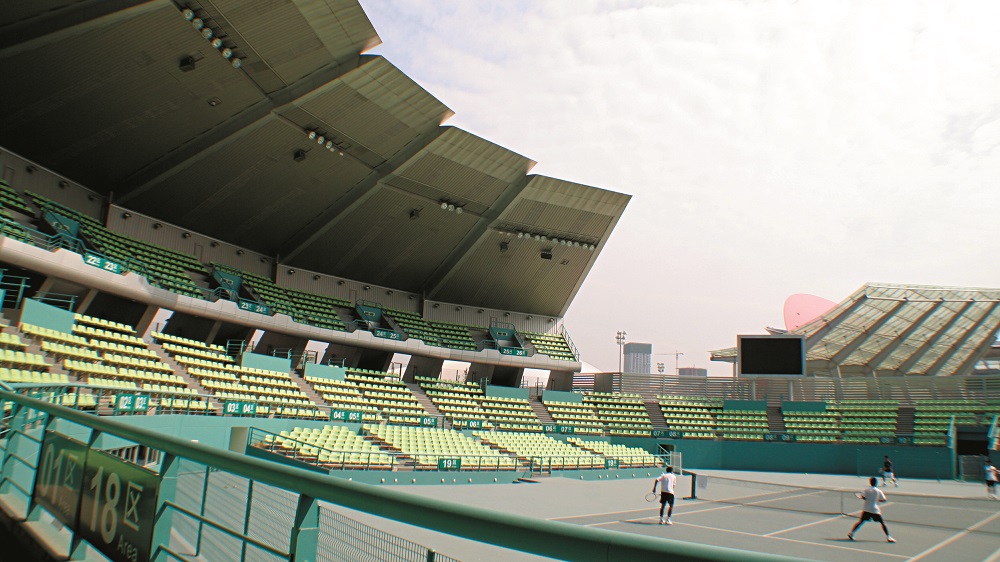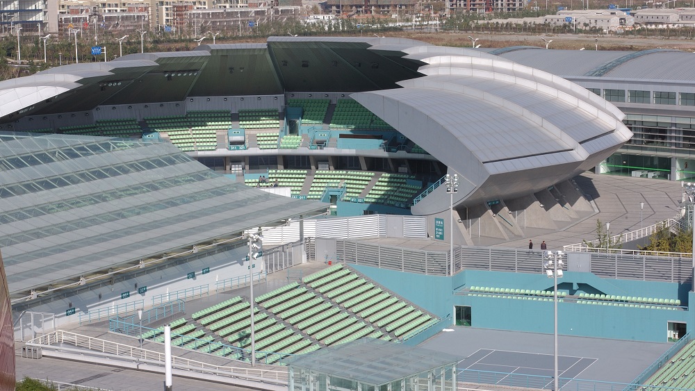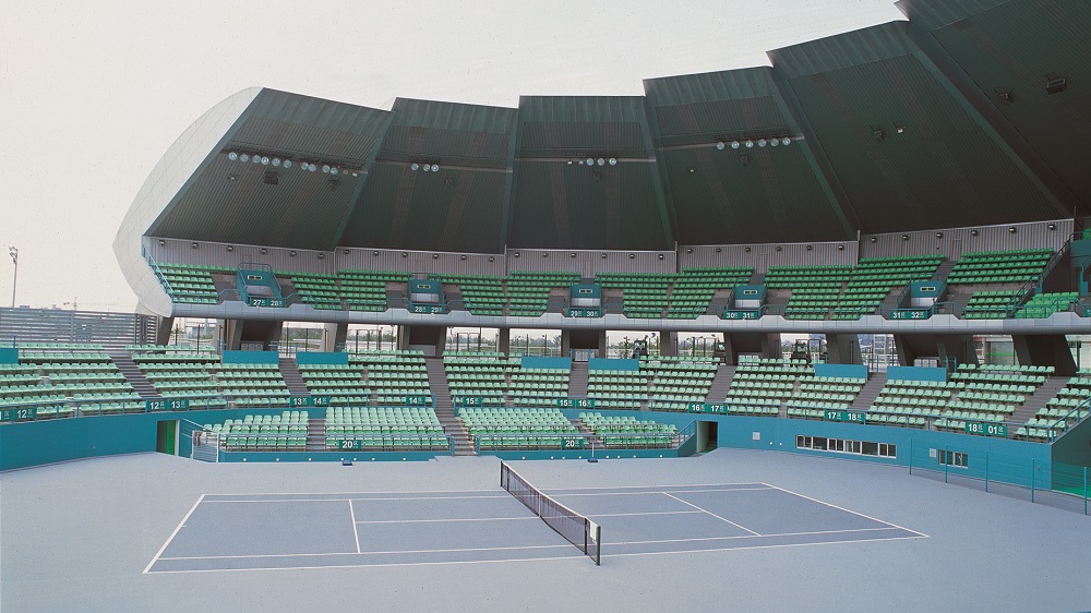 网球中心的设计创意是体育和自然。设计灵感来自于对大自然中鲜花美丽的向往和果实成熟的喜悦。主入口的玻璃屋顶仿佛是两片巨大的绿叶漂浮在体育场与网球中心之间,决赛场的屋盖呈花瓣状层层相叠,覆盖在半敞开的观众席的上方,整体建筑与周边水景环境遥相呼应,营造出一种愉悦的氛围,激发了观众参与盛事的热情。网球中心建筑面积约3.9862万平方米,设有一个决赛场、二个半决赛场、十四个露天球场以及五个室内场地。其中决赛场可容纳4000名观众,每个半决赛场可容纳2000名观众。