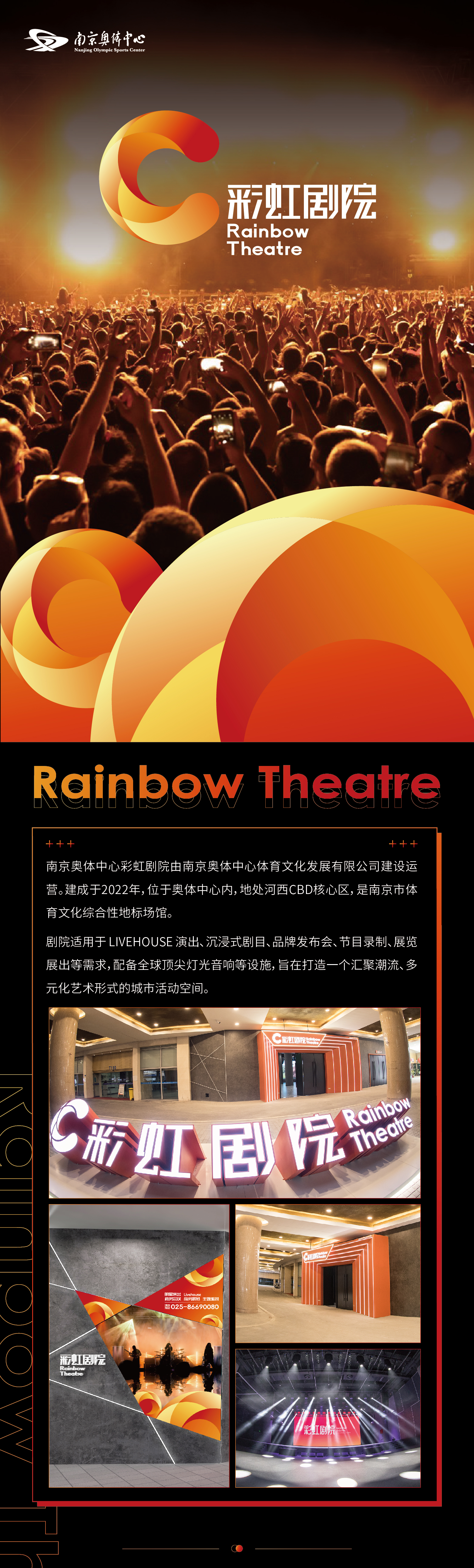 彩虹剧院 Rainbow Theatre南京奥体中心彩虹剧院由南京奥体中心体育文化发展有限公司建设远营。建成于2022年,位于奥体中心内,地处河西CBD核心区,是南京市体育文化综合性地标场馆。剧院适用于LIVEHOUSE 演出、沉浸式剧目、品牌发布会、节目录制、展览展出等需求,配备全球顶尖灯光音响等设施,旨在打造一个汇聚潮流、多元化艺术形式的城市活动空间。