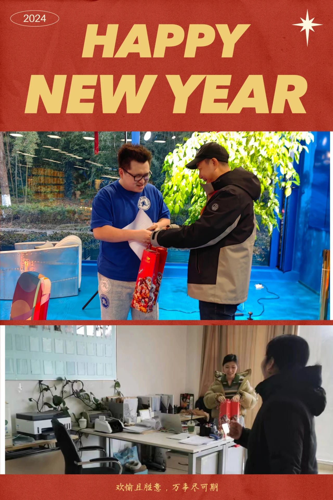为回馈园区商户,南京奥体中心给全体商租户送去春联福袋,向他们致以节日的祝福和问候,祝他们龙年生意兴隆,财源滚滚。